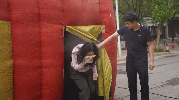 疏散后,員工到達指定實操體驗場地,進行安全屋體驗與滅火器實操。在模擬充滿濃煙且黑暗的“安全屋”中,員工親身體驗了“保持低姿、沿墻摸索”等關(guān)鍵逃生技巧。隨后,在專業(yè)人員指導(dǎo)下,員工熟練運用“提、拔、握、壓”四步法,分組進行滅火器實操,有效掌握撲滅初期火災(zāi)技能,克服了面對真實火情的心理壓力。